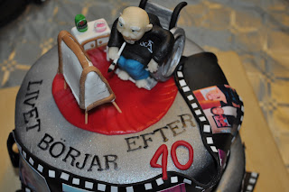 När Albert skulle fylla 40 slog vi (jag och Alberts fru Joanna) våra kloka hjärnor ihop och designade en superhäftig tårta som skulle påminna honom om alla de glada och lyckliga stunder i hans liv före 40 samt skoja lite med hans åldrande genom att visa att han har så mycket mer att se fram emot :)) (som löständer, lugn och ro och tid för sig själv och sin hobby). Det var jätteroligt att fixa denna tårta för att jag har fått leka med nya grejer - ätbara bilder som jag beställt enkelt och snabbt hos Pehrnilla på strosselannat.se och ätbar silverspray - också det enkelt och mycket effektfullt.